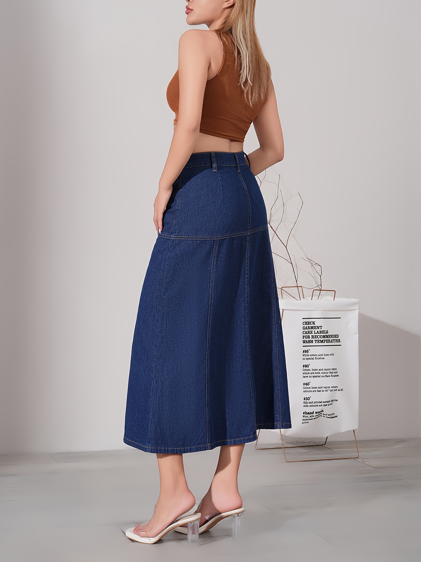 Dark Washed Women's Casual Midi Denim Skirt, Blue Jeans Style, Classic Fit