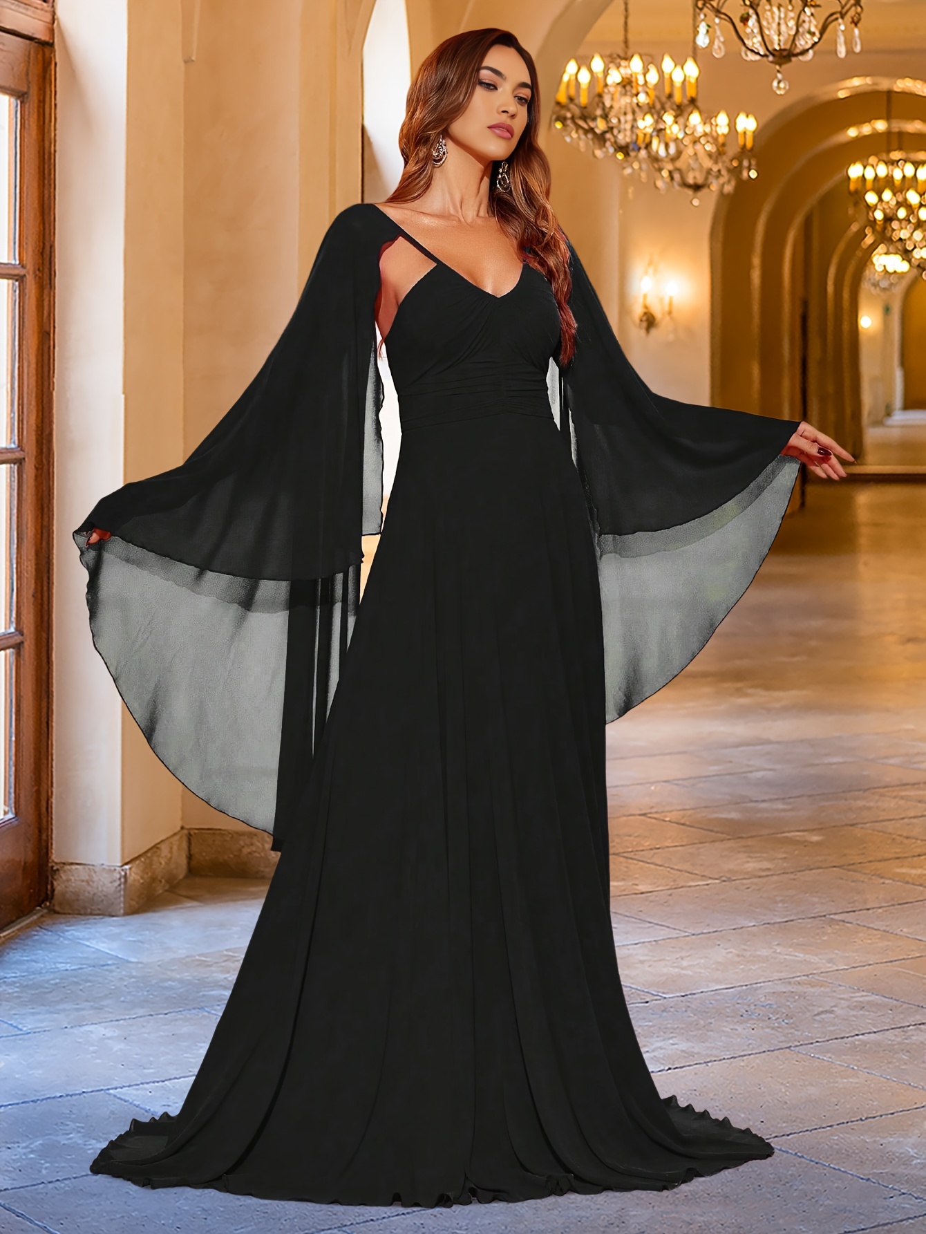 Elegant V-Neck Long Sleeve Sheer Shawl Dress with Exposed Back, Knit Fabric, A-Line Style, Solid Color, Super Long Length, All-Season Adult Dress