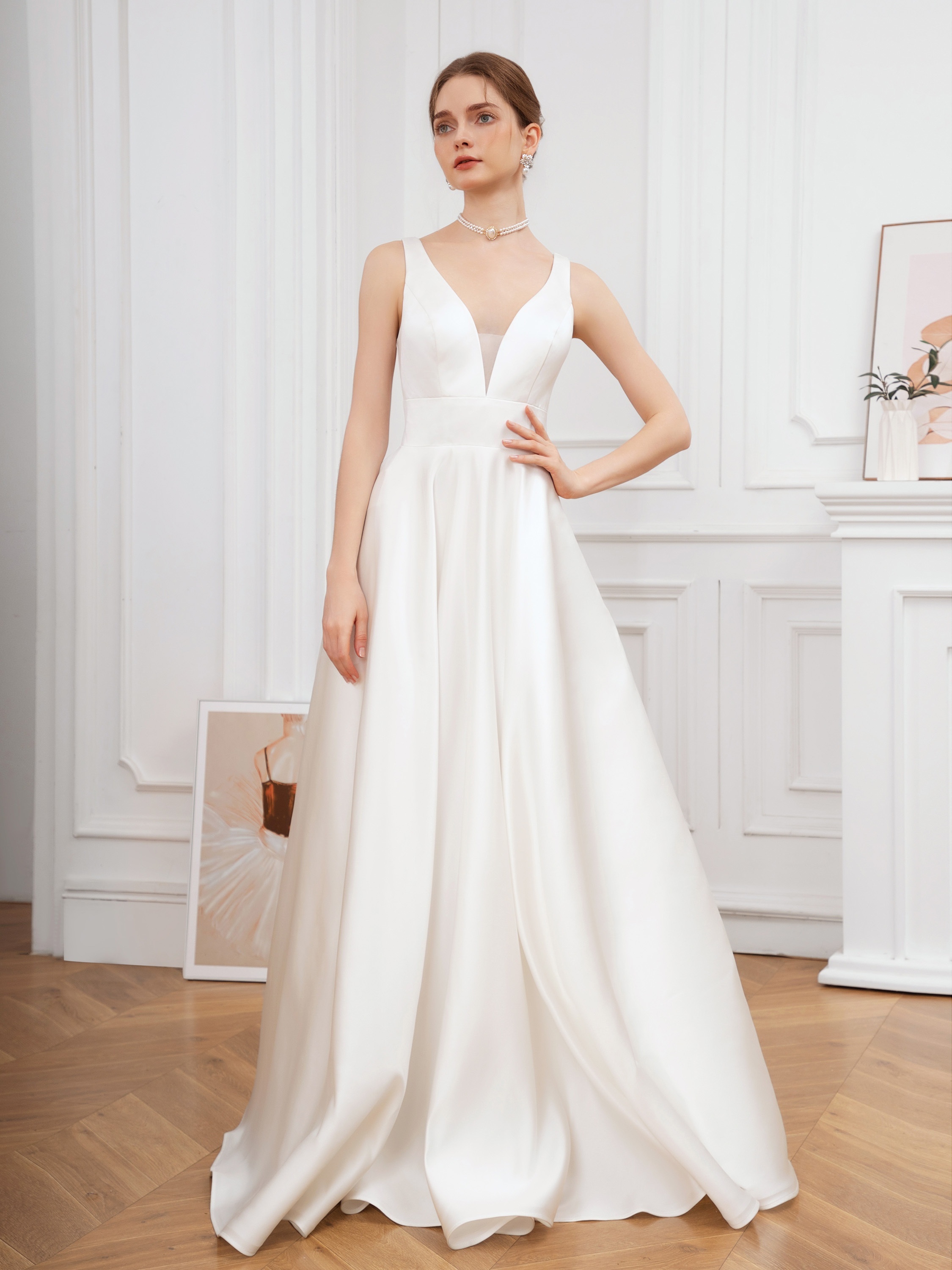 Elegant V-Neck Sleeveless A-Line Wedding Gown with Pencil Skirt and Exposed Back