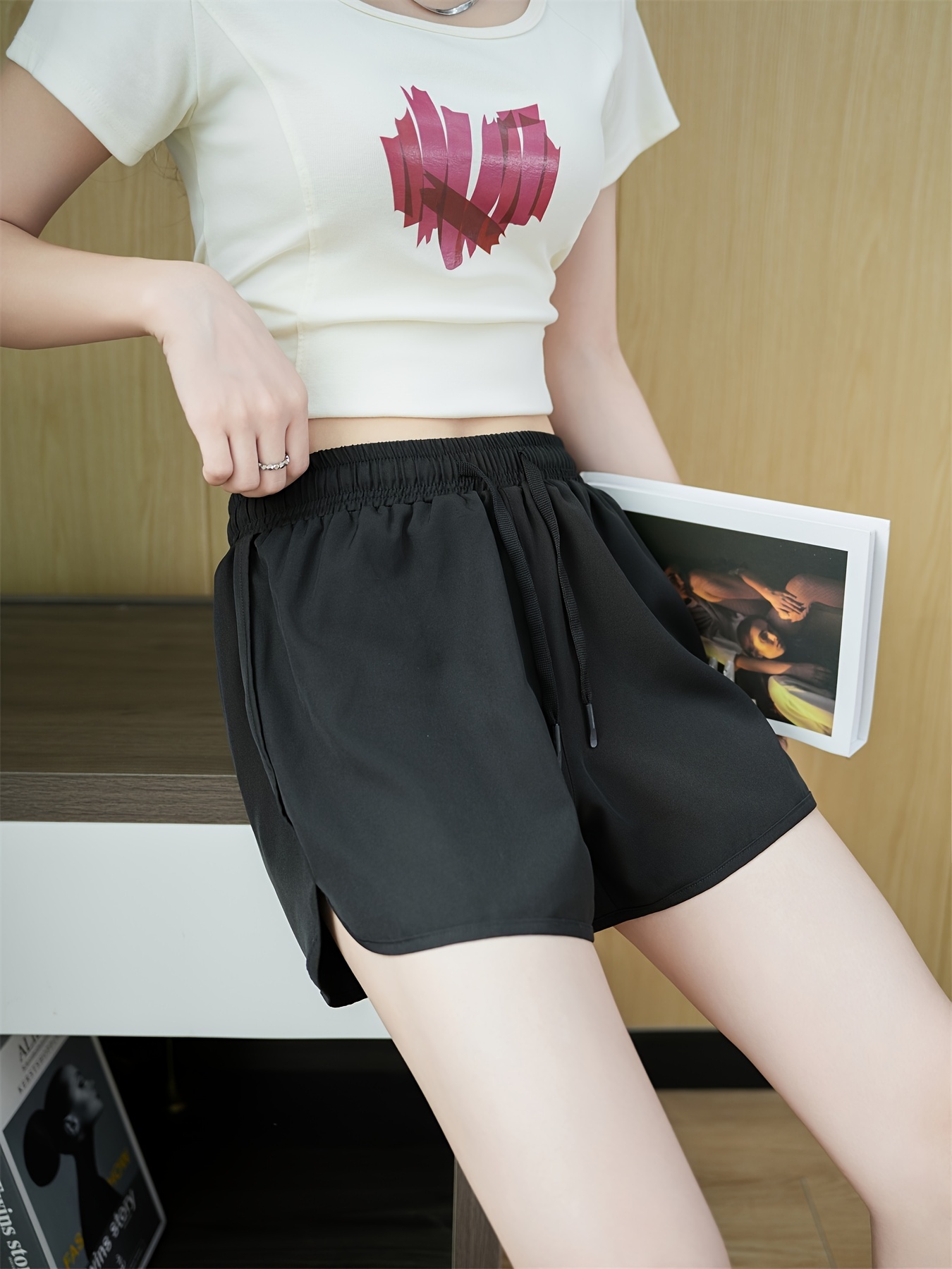 Solid Color Drawstring Shorts, Casual Elastic Waist Shorts For Spring & Summer, Women's Clothing
