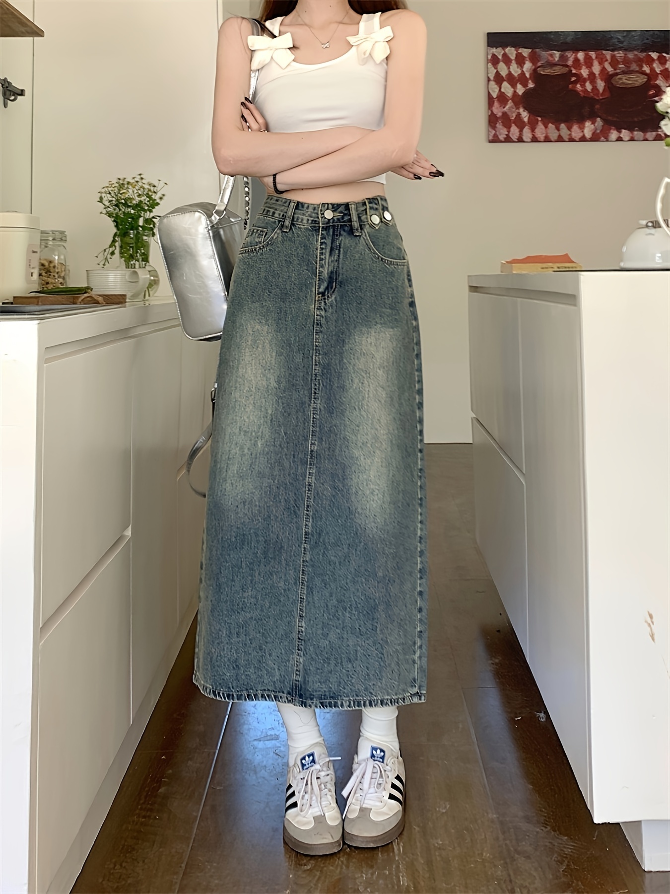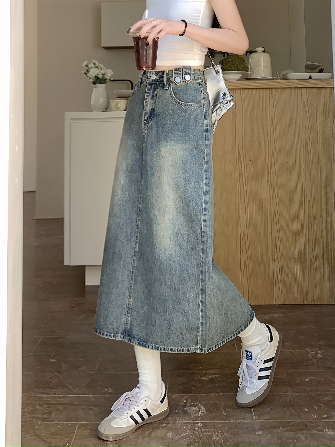 Vintage-Inspired High-Waist Split A-Line Denim Midi Skirt - Slimming, Casual Style with Button Detail, Machine Washable