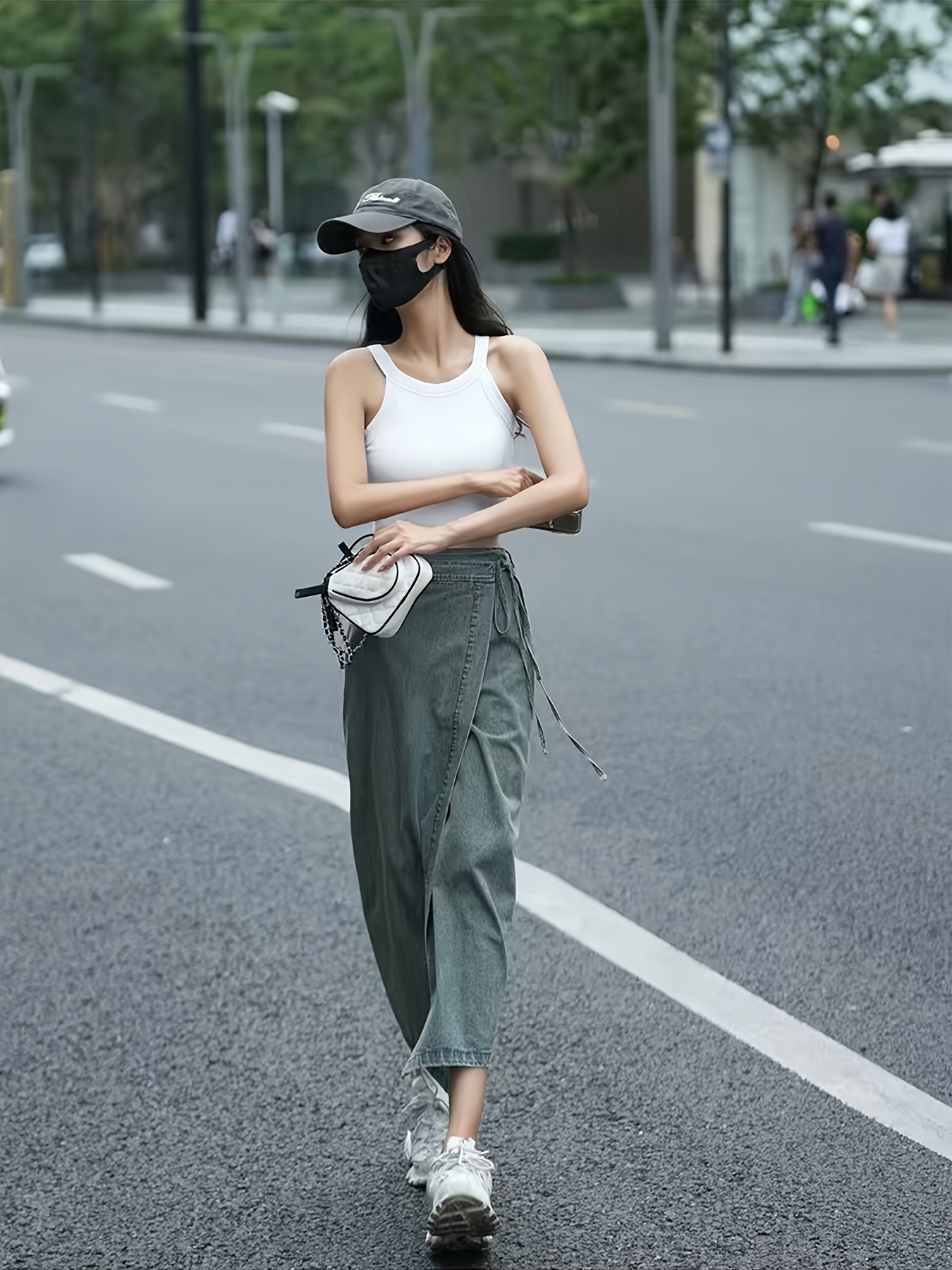 Women'S Elegant Denim Wrap Skirt - High Waist Lace-Up Slit Midi Skirt, Cotton Blend, Geometric Pattern, Woven Fabric, Non-Stretch for Spring/Summer/Fall
