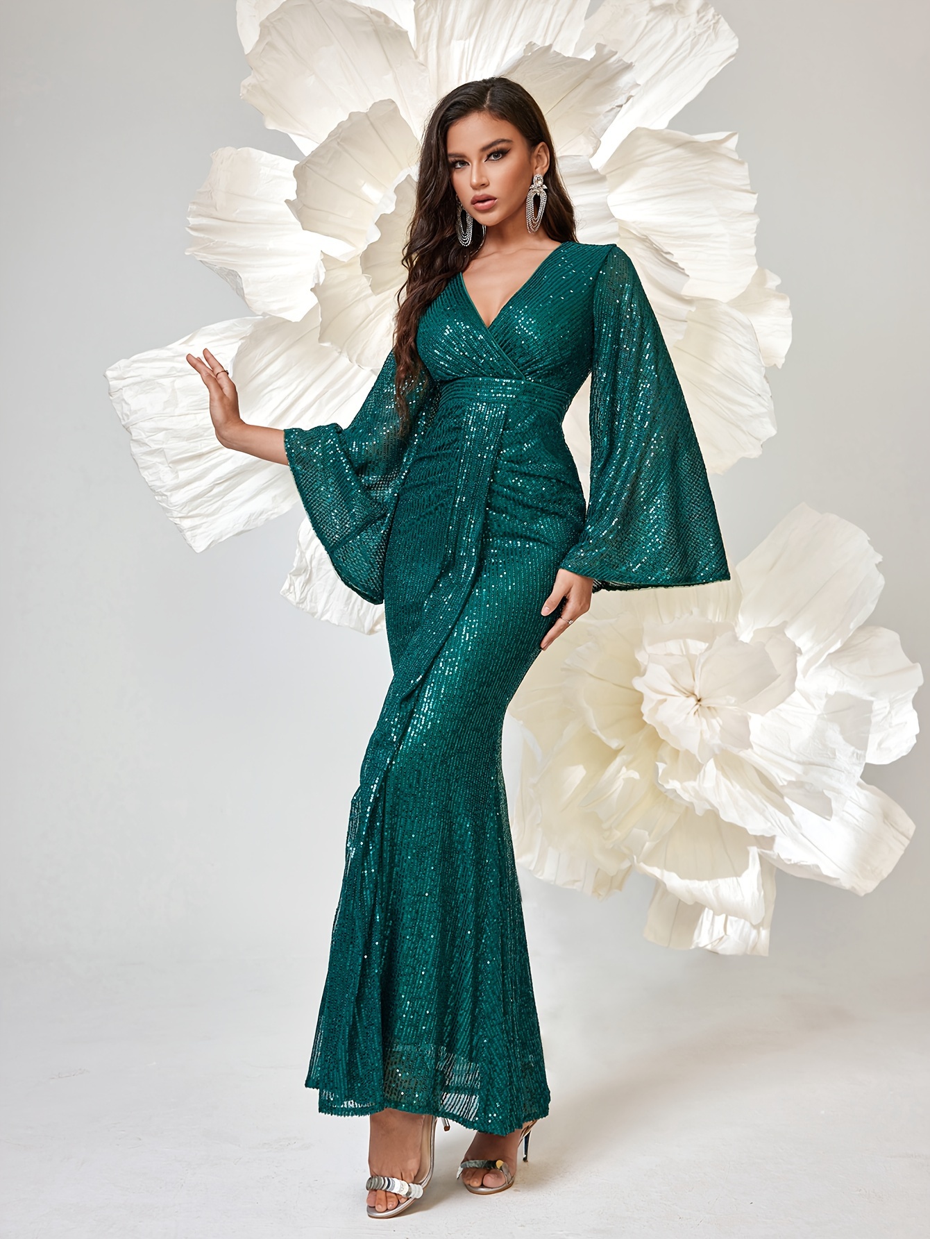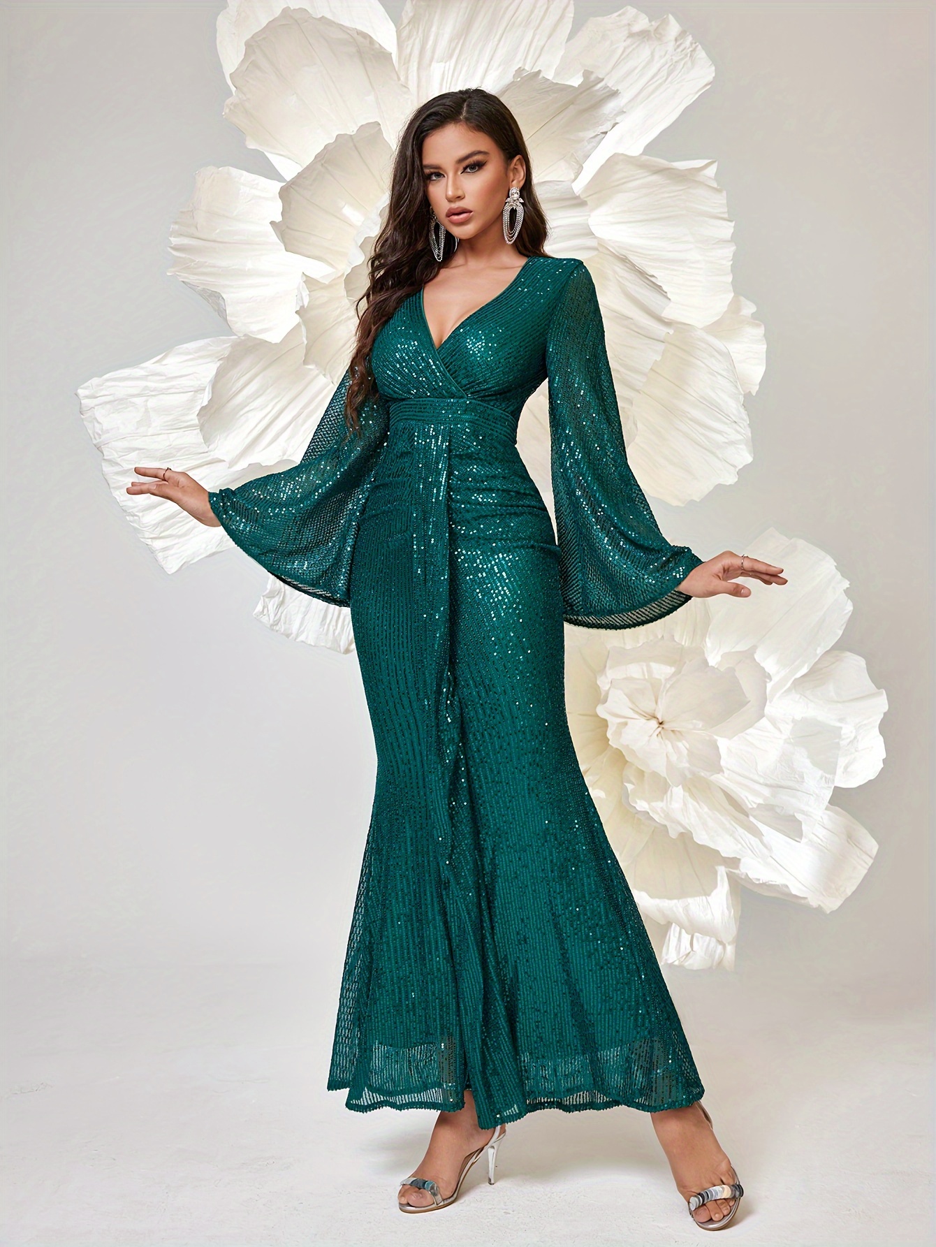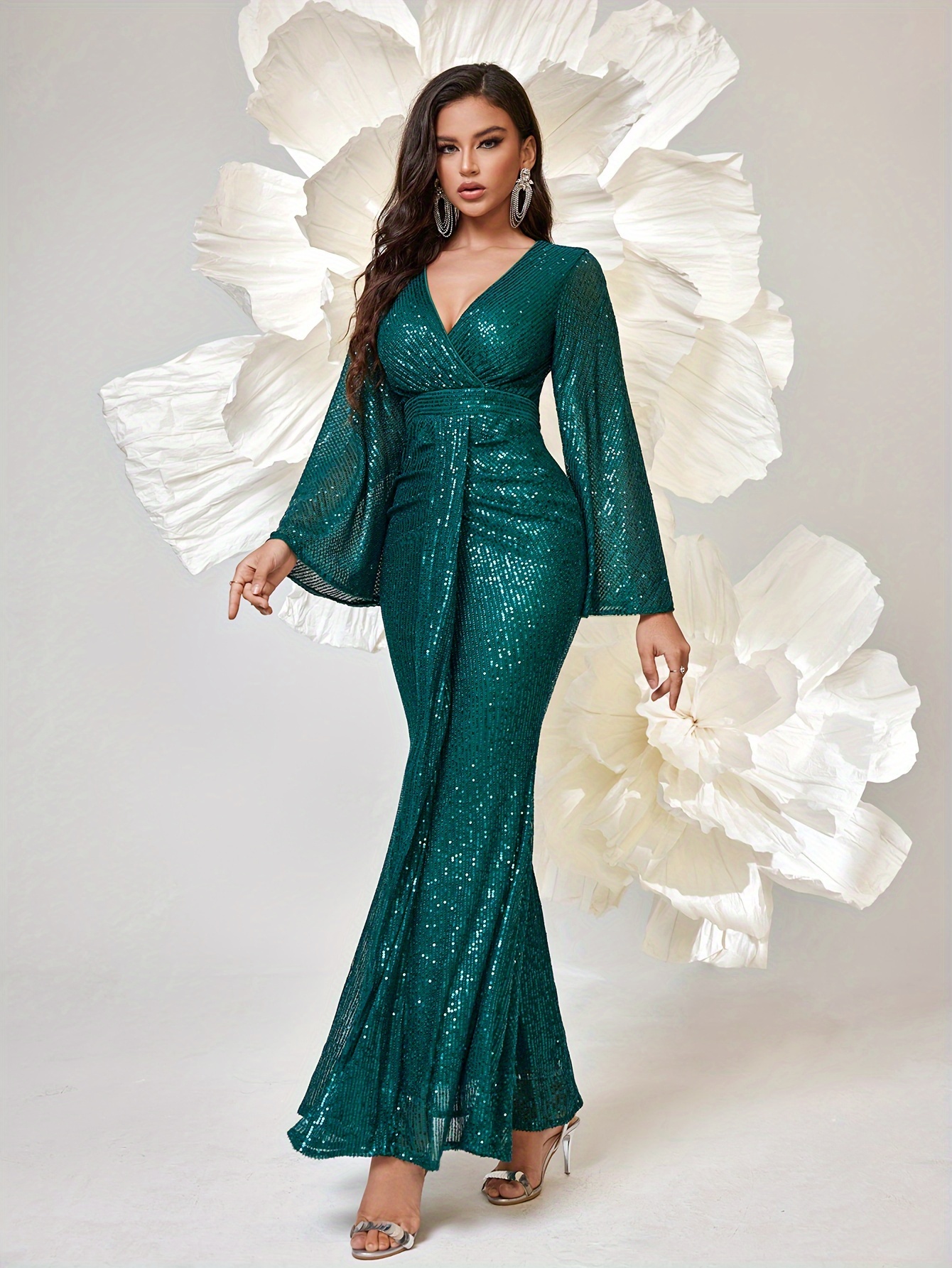 Long Sleeve Shiny Sequin V-neck Elegant Mermaid Hem Formal Dress for Party & Banquet, Women's Clothing