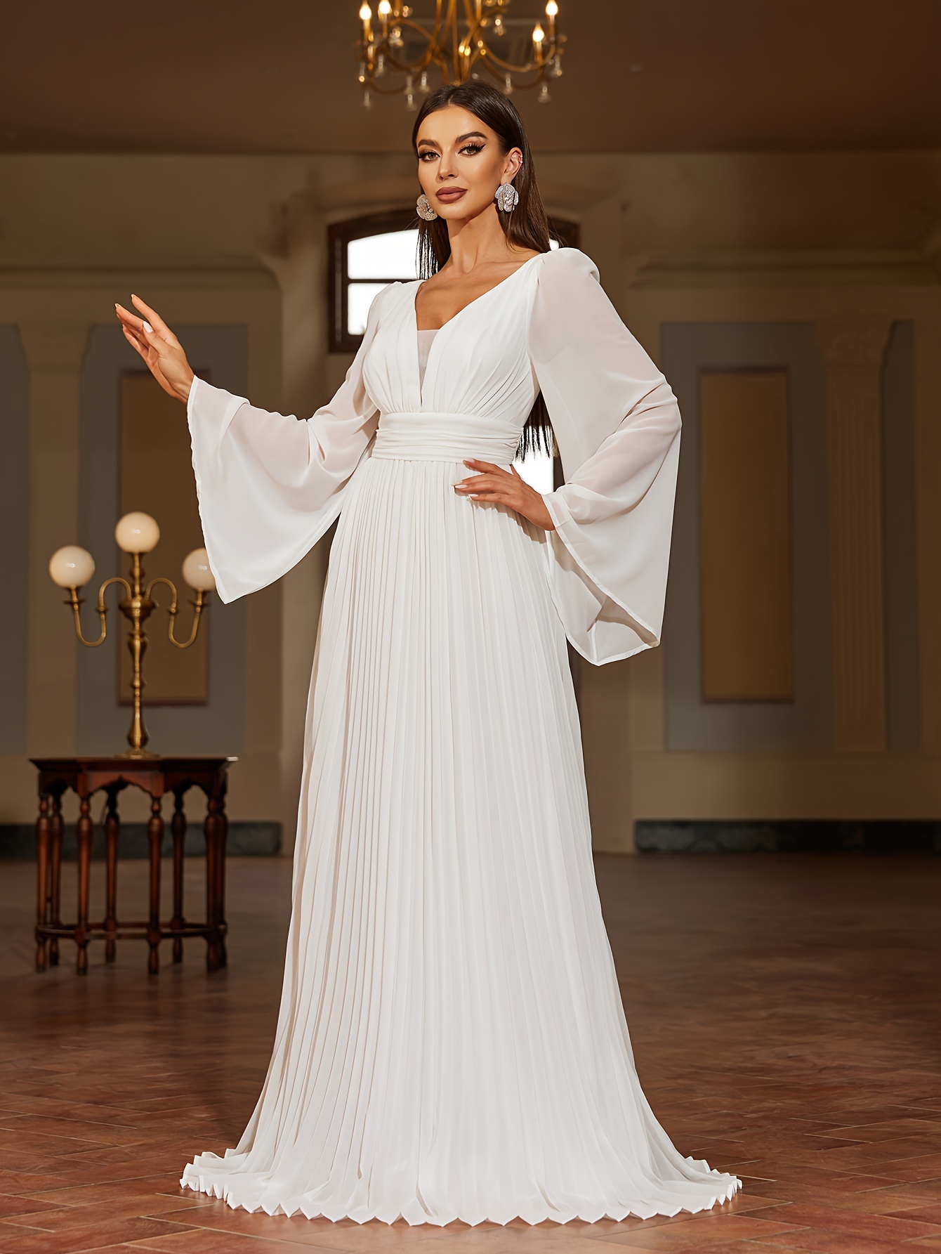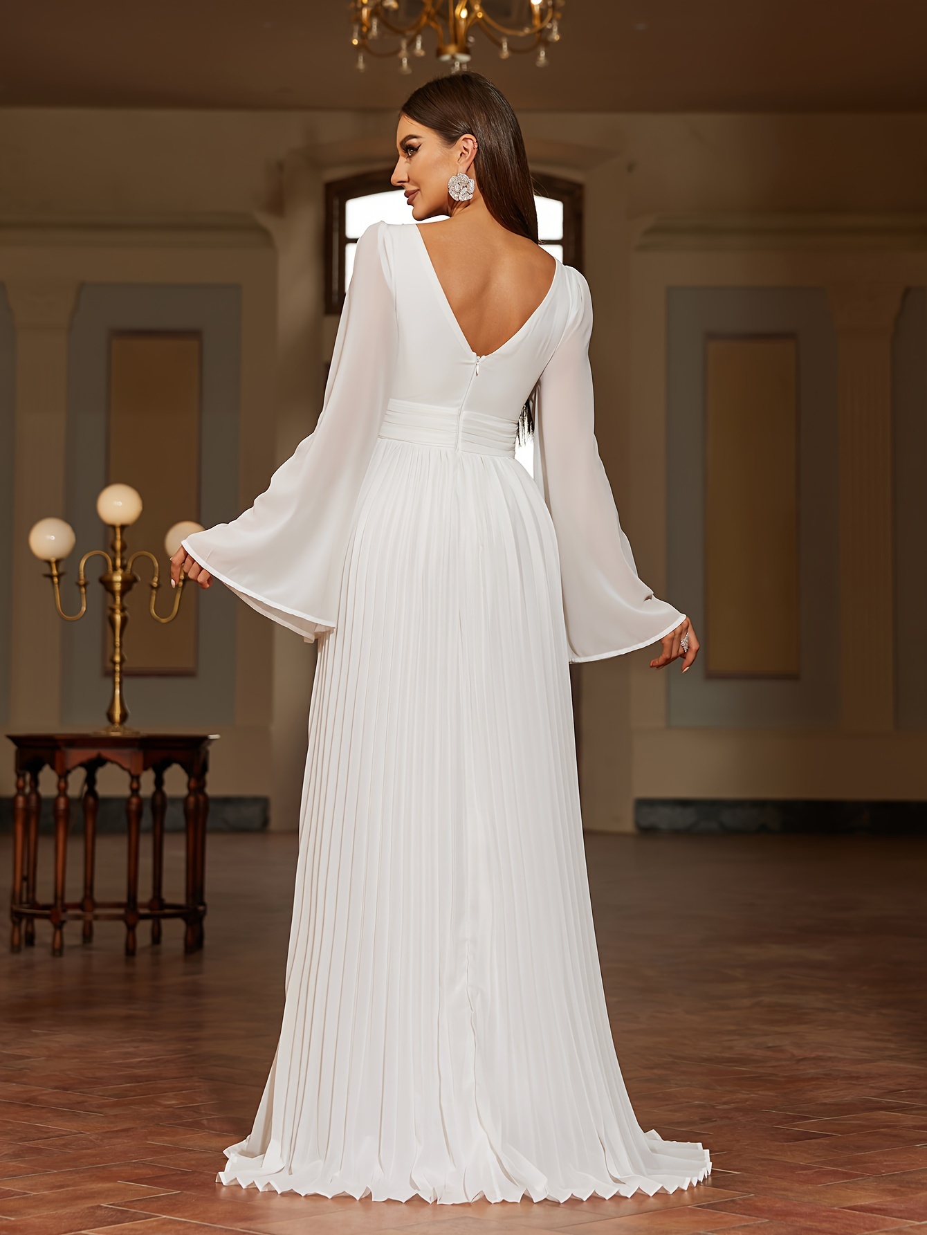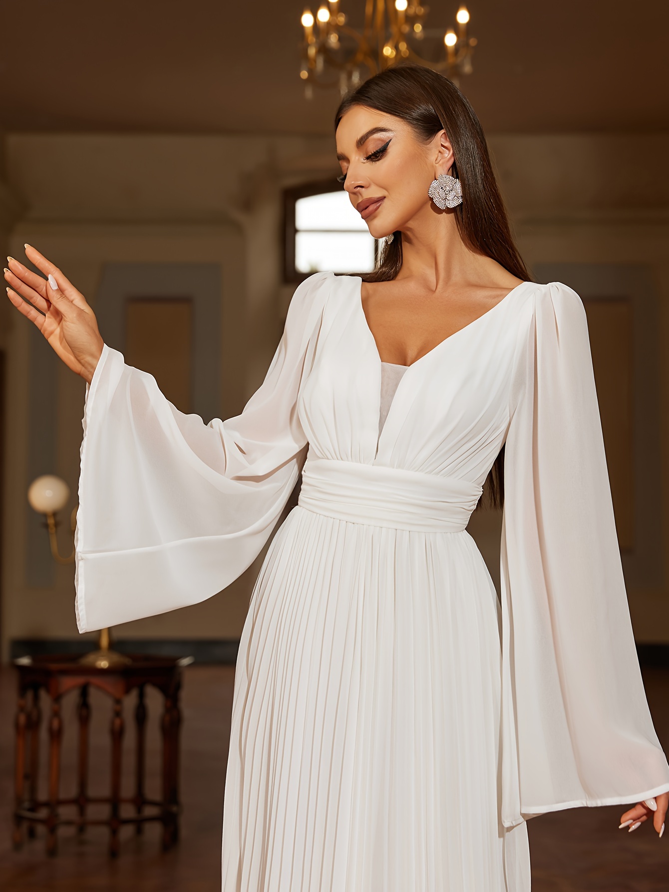 Solid V-neck Pleated Sweep Train Dress, Elegant Flare Sleeve Trumpet Dress For Wedding Party, Women's Clothing
