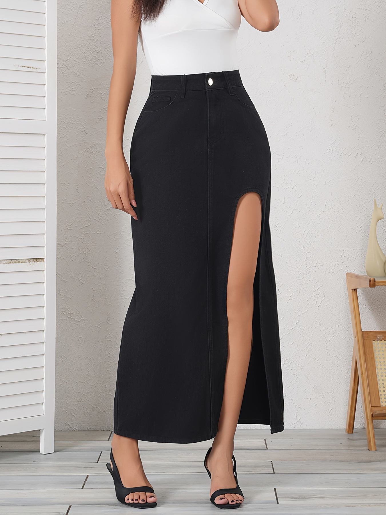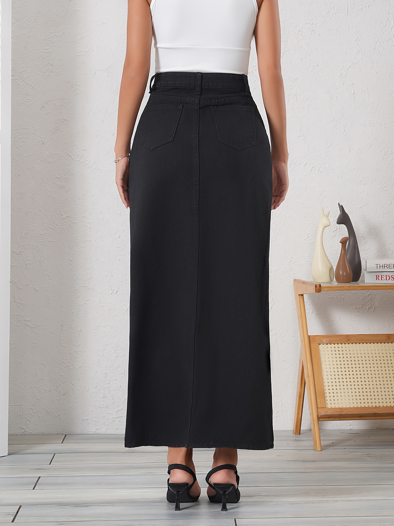 Elegant Black Denim Midi Skirt for Women - Asymmetrical, Non-Stretch, Machine Washable - Perfect for Spring/Summer/Fall