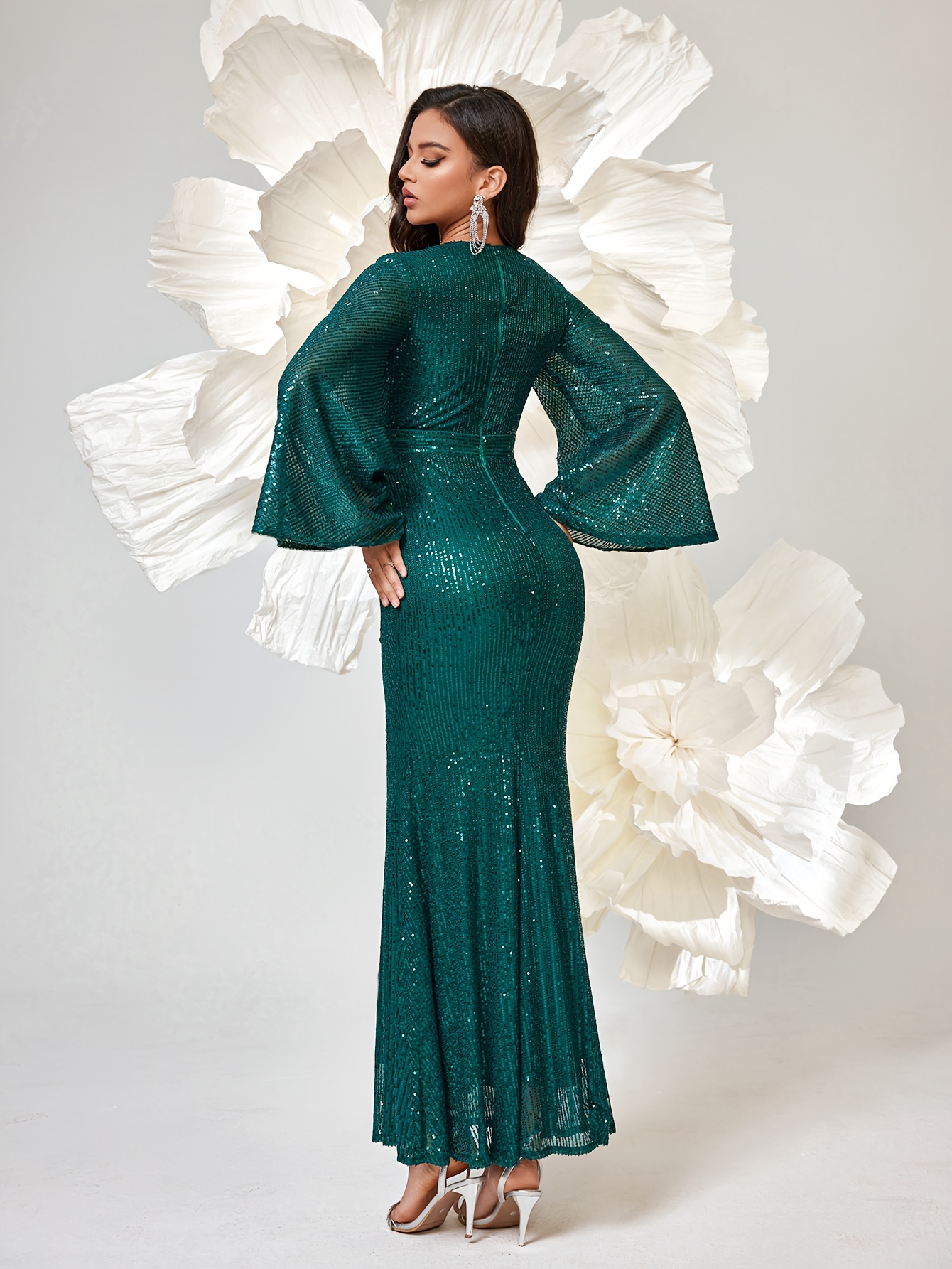 Long Sleeve Shiny Sequin V-neck Elegant Mermaid Hem Formal Dress for Party & Banquet, Women's Clothing