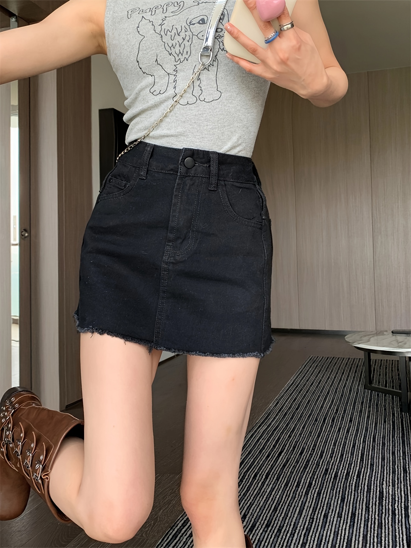 Women's High-Waisted Denim Mini Skirt, Sexy Black Color Plain Jean Skirt, Frayed Hem, Casual Summer Outfit